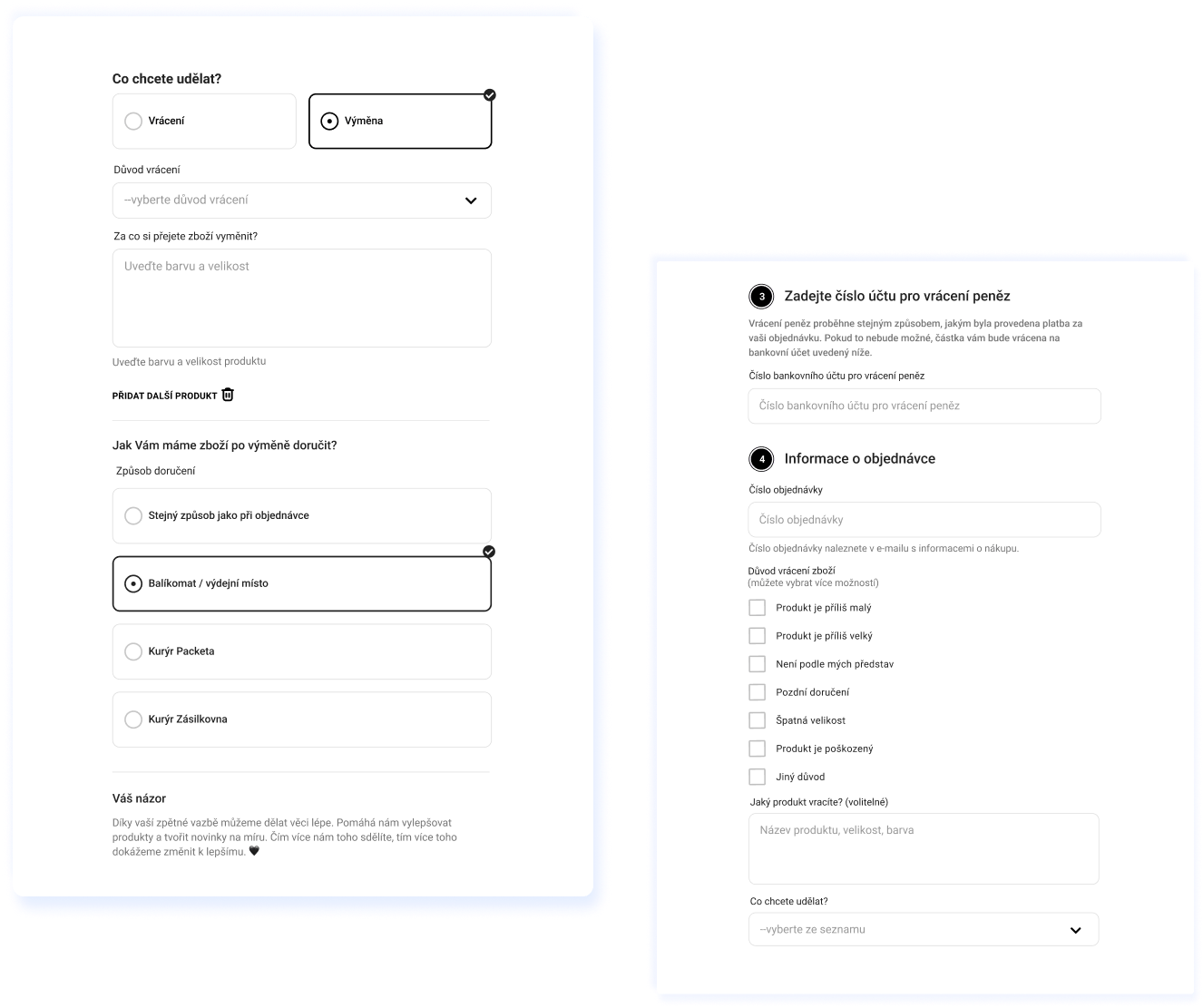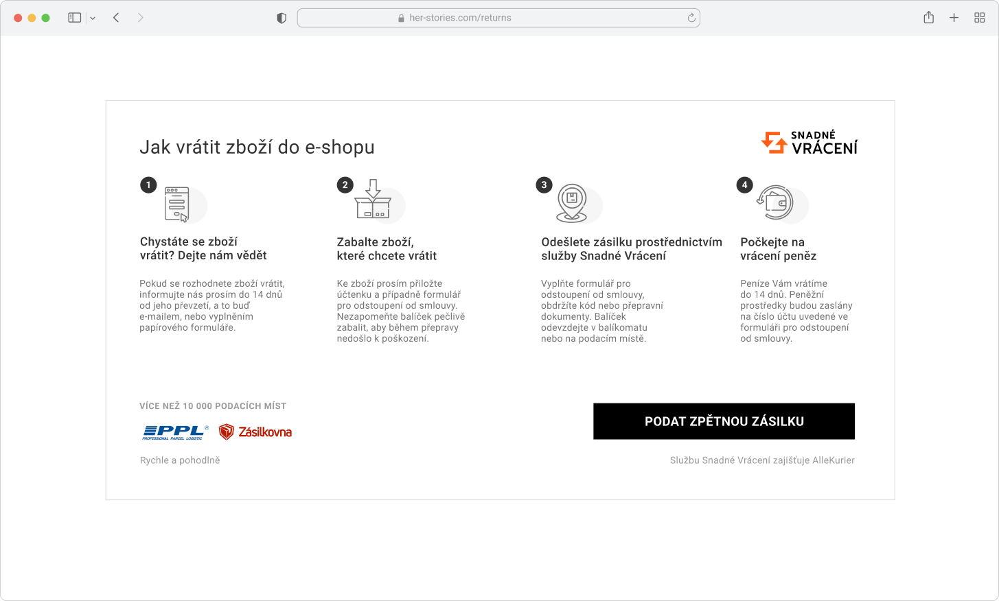 Kliknutím na tlačítko umístěné na banneru se zákazníci vašeho obchodu snadno dostanou k formuláři pro odeslání vrácené zásilky v rámci služby Snadné Vrácení. Ale to není vše – do formuláře můžete přidat další pole, která vám umožní zjišťovat důvody vrácení. Je to skvělý způsob, jak se zbavit papírových formulářů pro odstoupení od smlouvy.