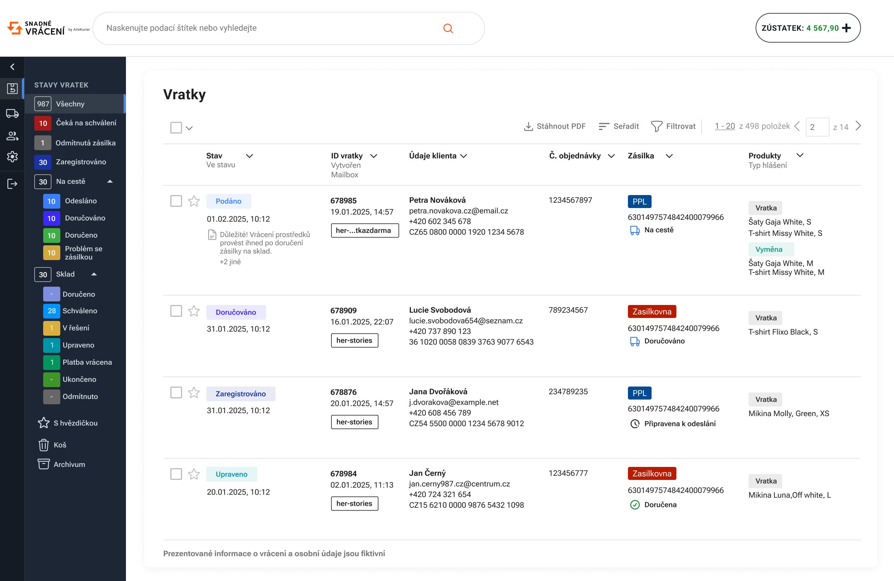 Získáte přehled o počtu vratek a jejich dopravcích, což výrazně zjednodušuje plánování a chod skladu.